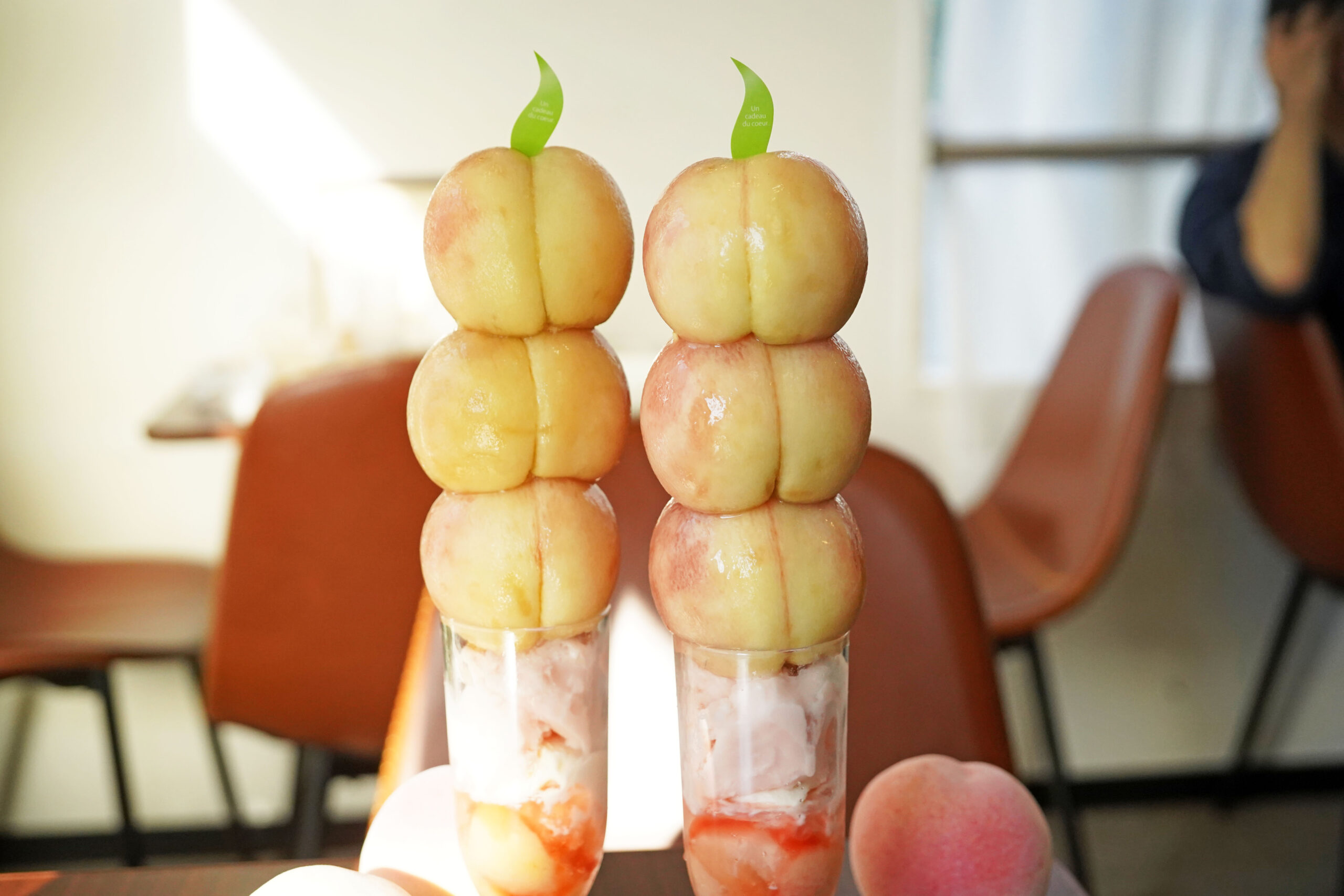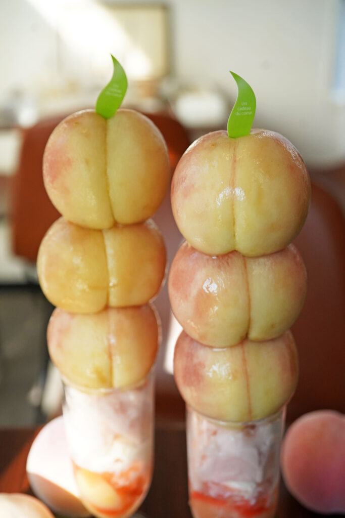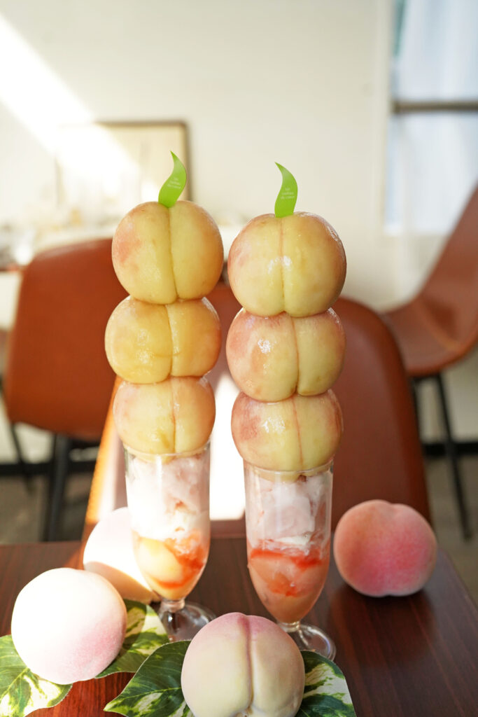 上に乗った3玉の桃は完熟桃にふさわしく柔らかくてジューシーで、中のクリームと合わせて味の変化を楽しめます。