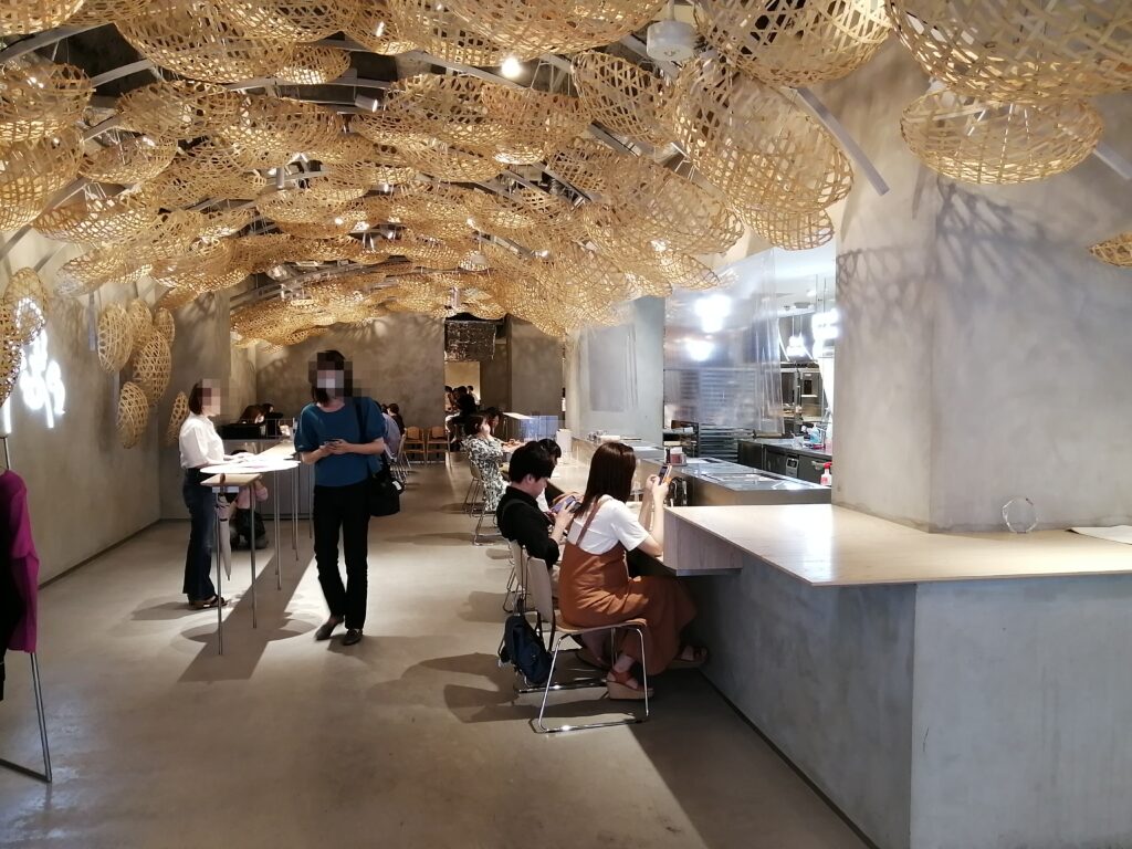 内装は建築家の「隈 研吾」さんが手がけ『奥へと導く竹かごの空間』をテーマに京都嵐山の竹を使用した伝統的な六ツ目編みのかご572個を壁から天井までを覆うように飾っています。