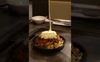 豚玉お好み焼きにふんわり玉子をかけたお好み焼き。