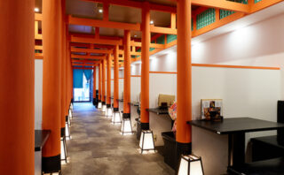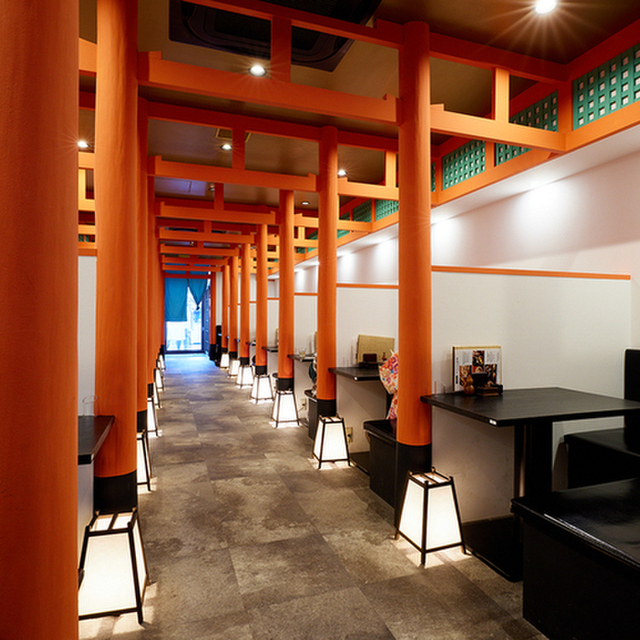 伏見稲荷の千本鳥居をイメージさせるような内観が特徴的。