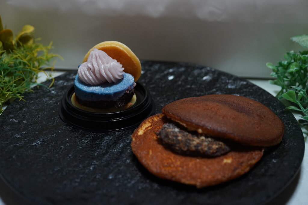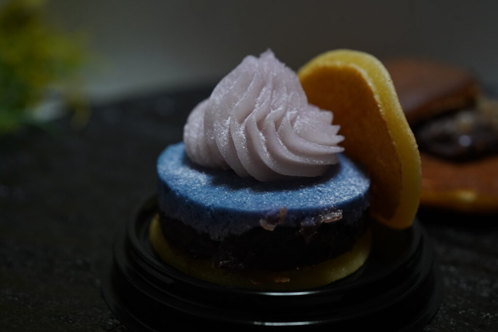 あんこの上に紫芋を練り込んだ白餡さらにほどよい甘さの紫芋ムースをのせた見ているだけでわくわくするような創作どら焼き。