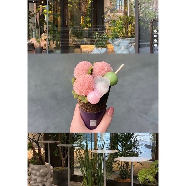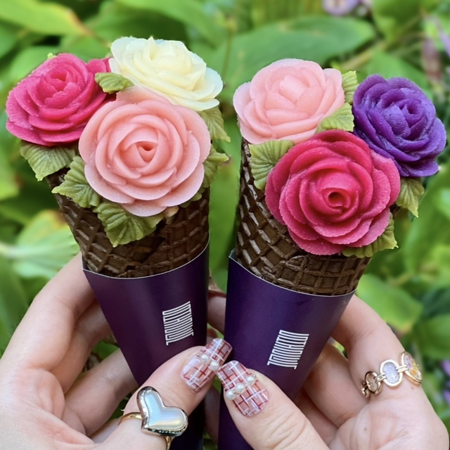 バニラアイスクリームを入れたチョココーンの上に三色の花びらが咲き誇るまさに美しい花束のようなスイーツ。