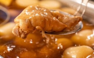 表面のカリカリ部分とテビチのプルプル具合がいままでに食べたことのない味わいで、酢こしょうをつけるのがおすすめの食べ方。
