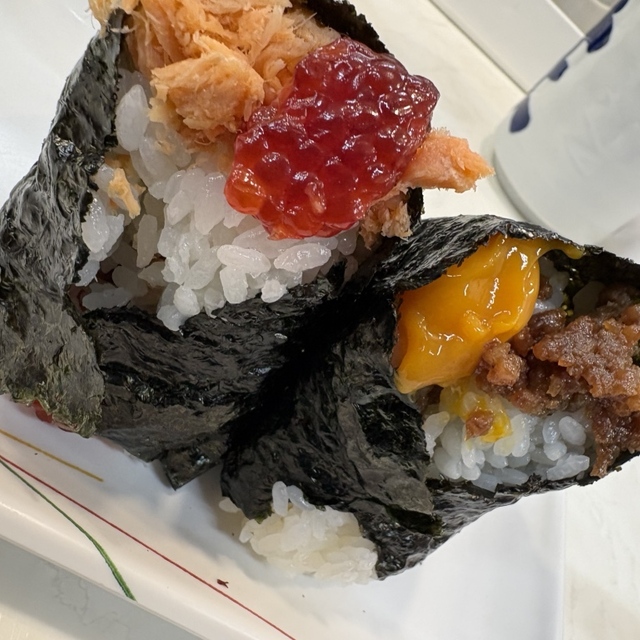 人気ランキングから、卵黄しょうゆ漬けを、定番から高菜、そしてミックスからおかか×チーズの3個を注文。