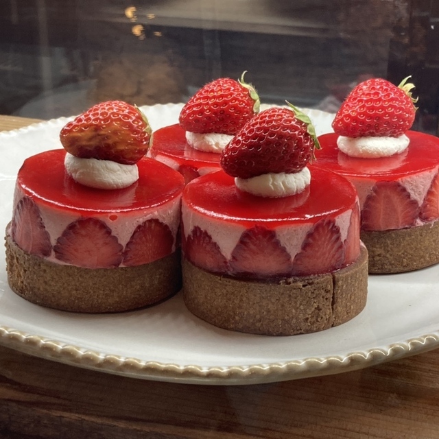 淡い塩気と甘さのバランスのとれた白餡桜クリームにもっちり求肥の下には一粒の苺が隠れていて遊び心のある季節感を感じられるタルトでした。