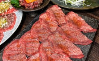 焼肉の定番メニューであるタン塩、お店オリジナルの塩胡椒がかかっています。