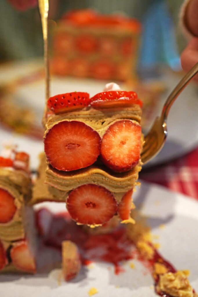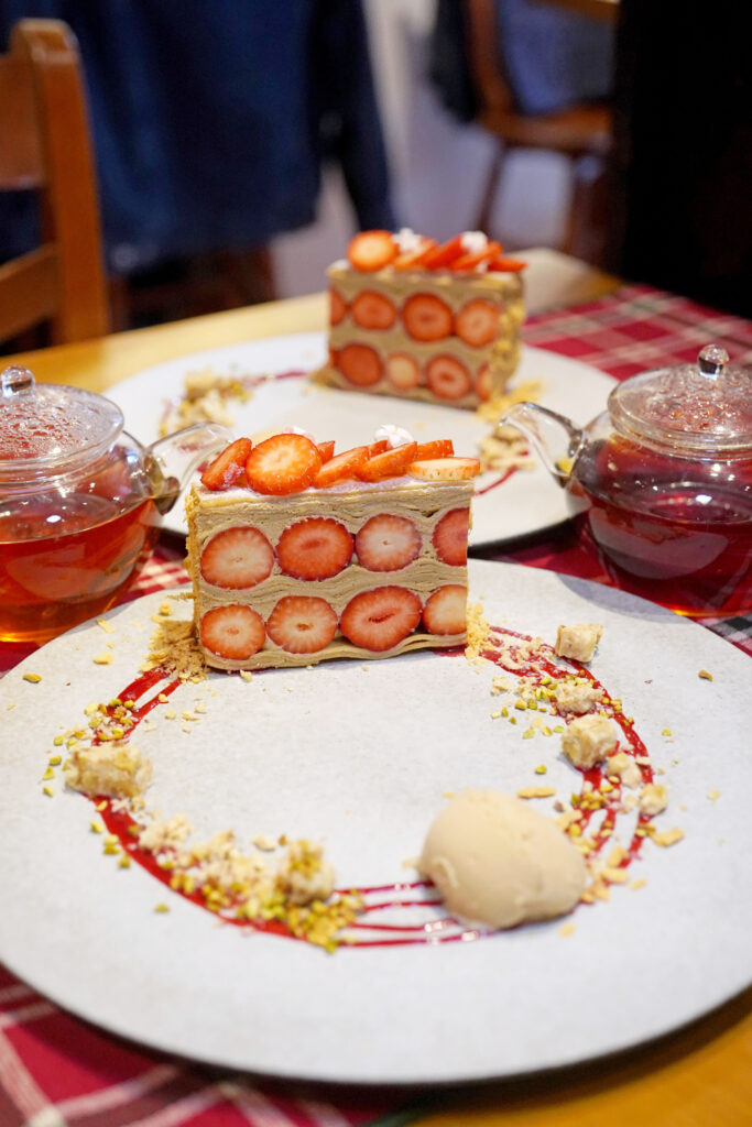 ミルクティー香るクリームをクレープ生地で何層にも重ね、冬苺を挟んだり、トッピングした数量限定のクレープ。