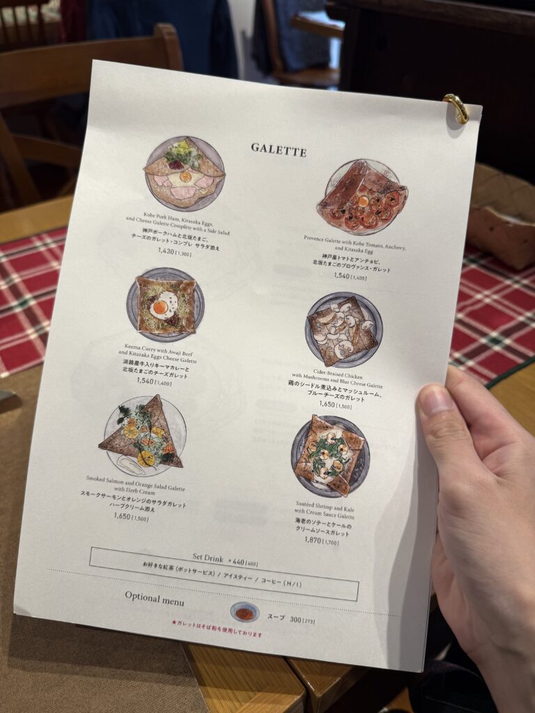 神戸ポークにトマトやマッシュルームなど神戸産の野菜を使った期間限定と定番の食事系ガレットが揃います。