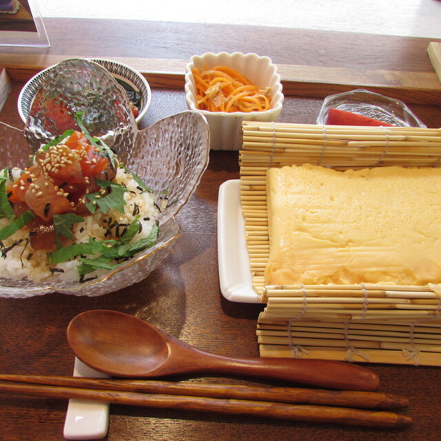 ランチはだし巻きに海鮮丼という組み合わせの定食に、だし巻きサンドイッチ。