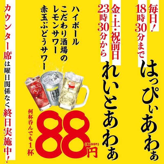 毎月8のつく日は、お酒や餃子が88円で楽しめるという嬉しいサービスを行っていて、ちょい飲みにもおすすめです!