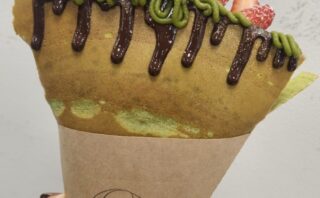 抹茶が香るパリパリ生地に甘味と酸味のバランスとれた夏だけの特別なイチゴと香り高い抹茶が合わさりボリュームもあって大満足のクレープ。