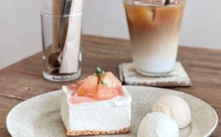 付け合せの桃の風味が上品なシャーベットに、ココナッツの食感がクセになるアイスを時折はさむと味に変化をつけられますね。