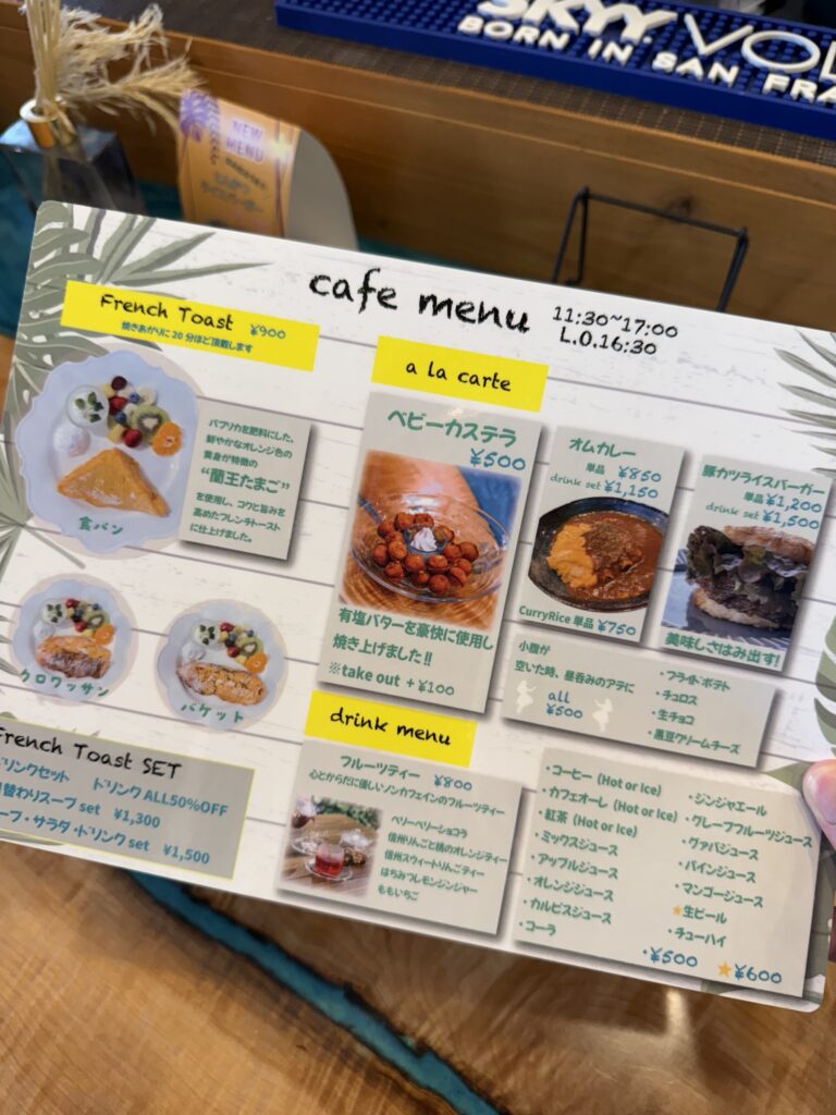 カフェの時間にはベビーカステラの他にフレンチトースト、オムカレーといったアラカルトをいろんなドリンクと一緒に楽しめます。