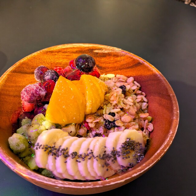 アサイーにバナナ、アップルジュースをブレンド、グラノーラ、バナナ、マンゴー、ベリーミックス、そしてキウイをトッピング、色合い鮮やかなアサイーボウル。