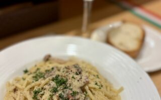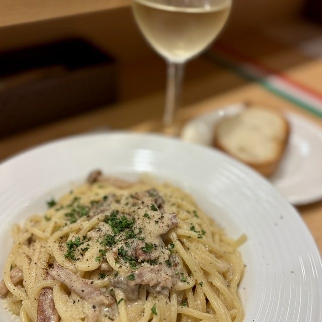 生パスタ180gを卵とベーコンが入ったクリームソースで和えたもの。
