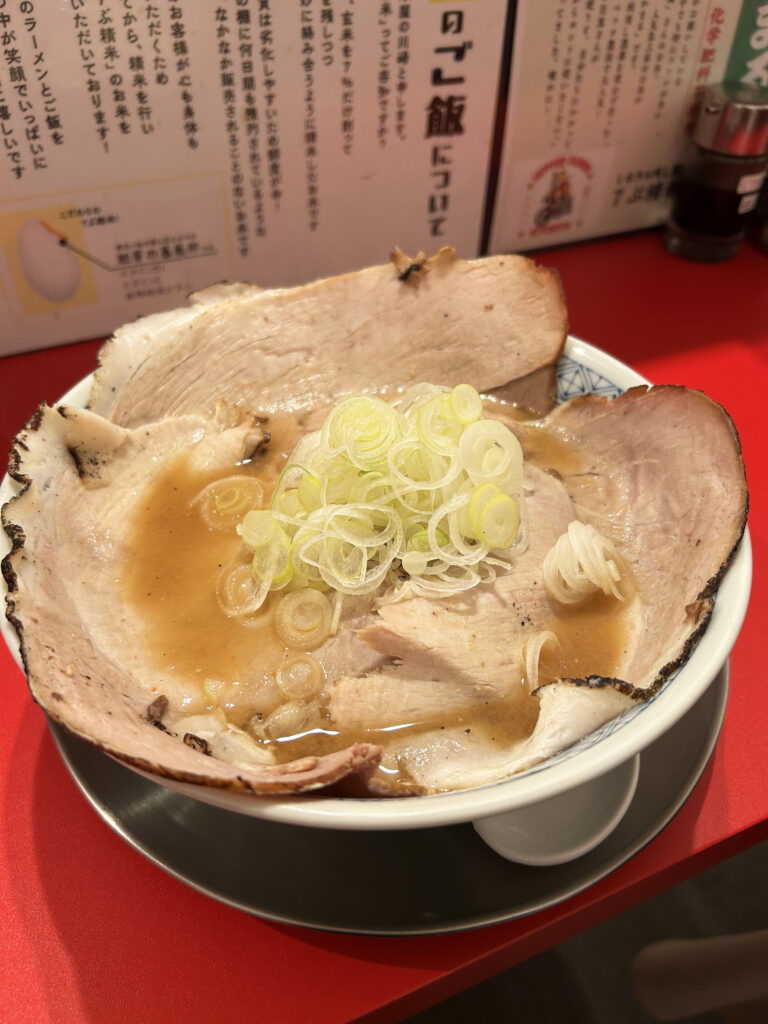 スープの味を邪魔しない様に、あえて薄味に仕上げた大判の特製豚モモチャーシューが麺を覆いつくすようにのった豪快なラーメン。