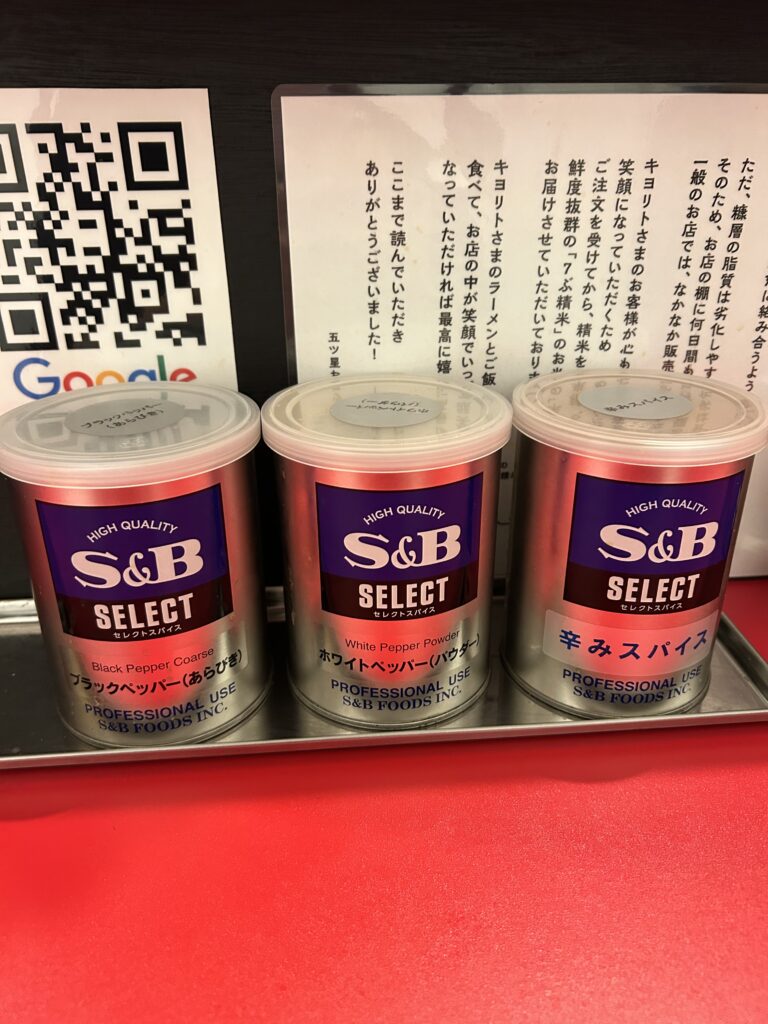 卓上にはブラックペッパー、辛みスパイスと味変アイテムがありましたよ。
