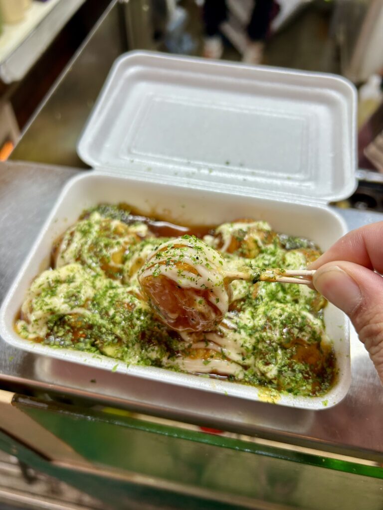 たこ焼きにソース、マヨネーズ、青のりがかかっています。
