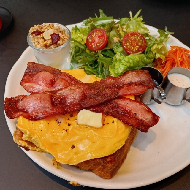 エッグベネディクトの他にパンケーキやフレンチトーストにベーコンエッグと塩気を加えたボリュームたっぷりのメニューがラインナップ。