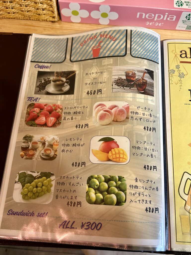 ドリンクはコーヒー、さまざまなフレーバーの紅茶があります。