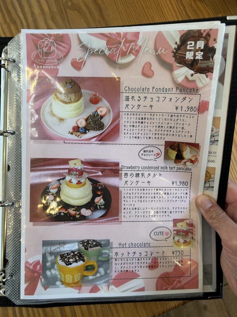 期間限定パンケーキもあって、2月はチョコレートに、苺を使ったパンケーキです。