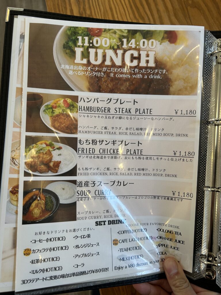 ランチタイムに注文できるメニュー、ハンバーグにスープカレーという内容。