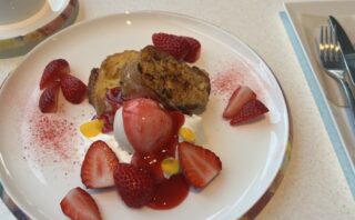 旬のフレッシュ苺に、苺のアイスクリーム、マスカルポーネクリームを添え、仕上げに自家製の苺ソースをかける苺づくし、五月までの期間限定メニュー。