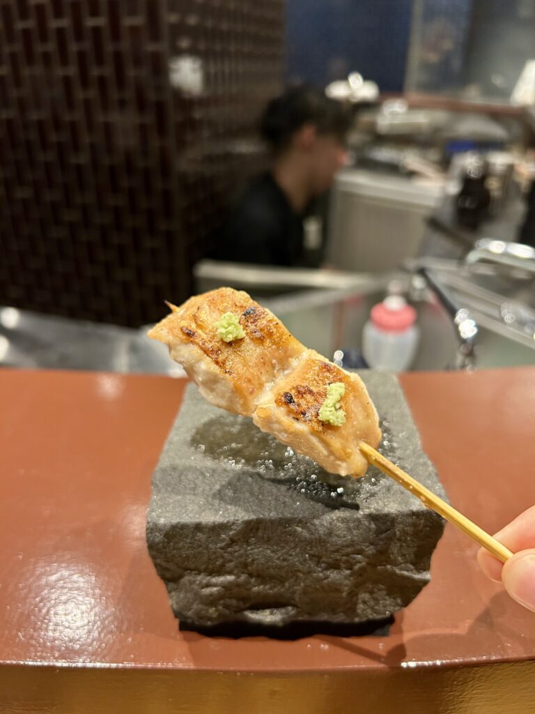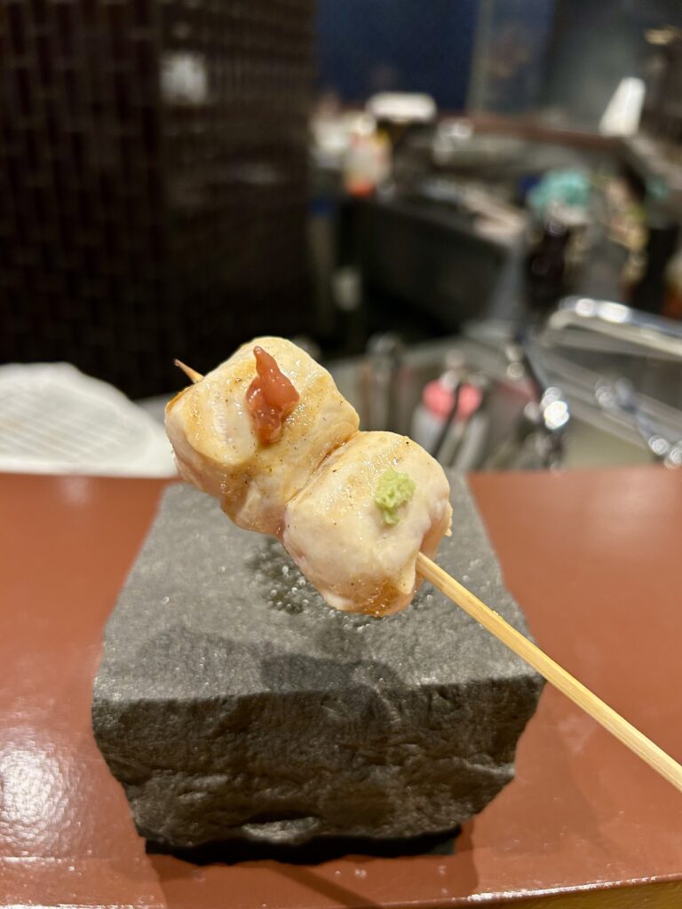 ここからは焼鳥、最初は歯切れの良いささみ、梅とわさびが付け合せ。
