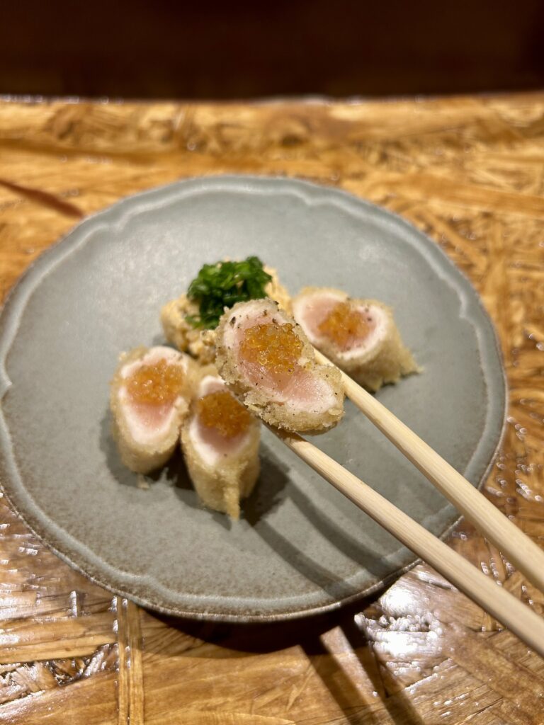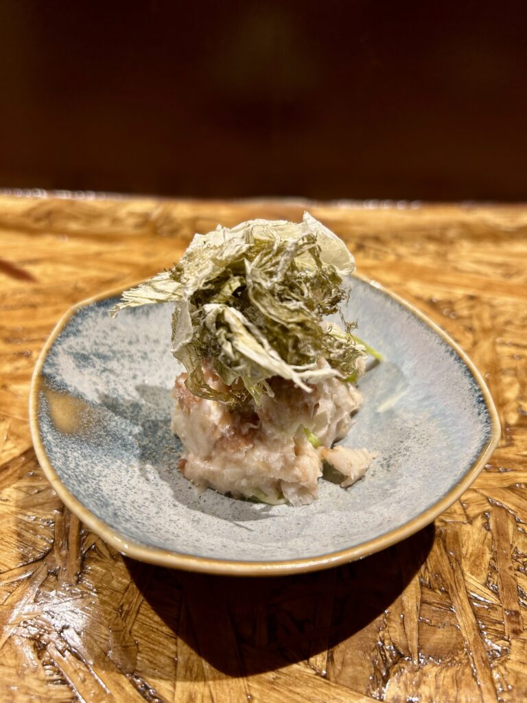 一品は笹身のレアカツ(自家製タルタル)、京鴨のロースト(カシスワインソース)、せせりとあおさのスパイス春巻き、名古屋コーチンのたたきの中から一種類選択。