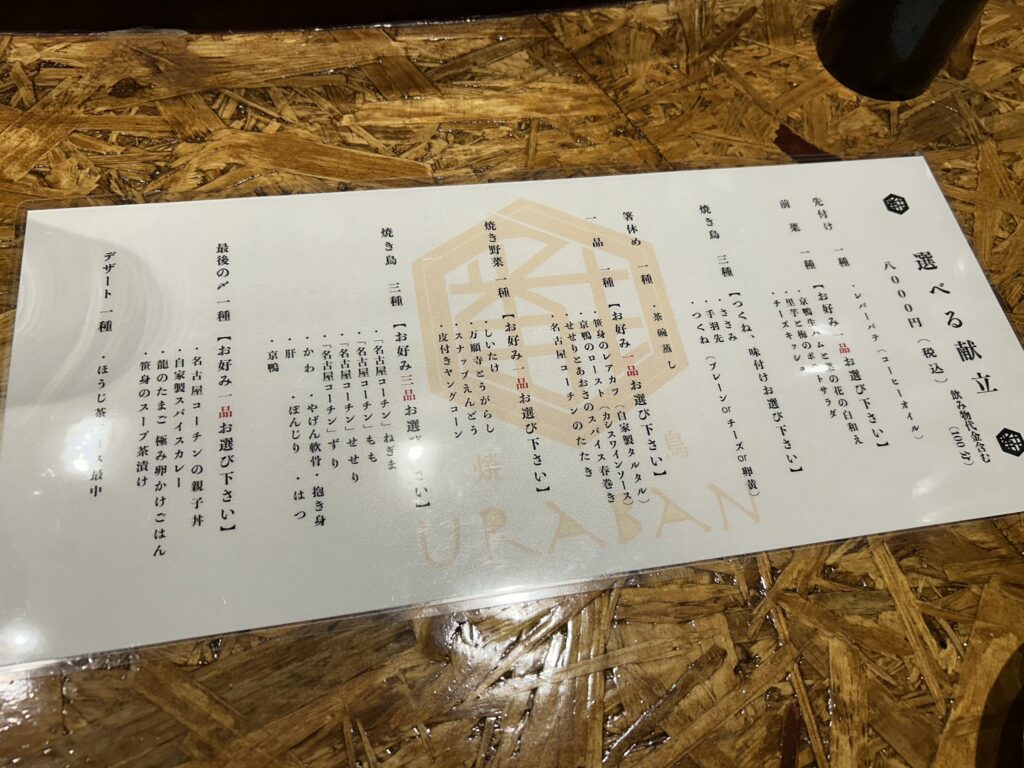 8,000円のコース一択で、前菜、一品、焼き野菜、焼き鳥、そして〆は数種類から自分の好きなものを選べます。
