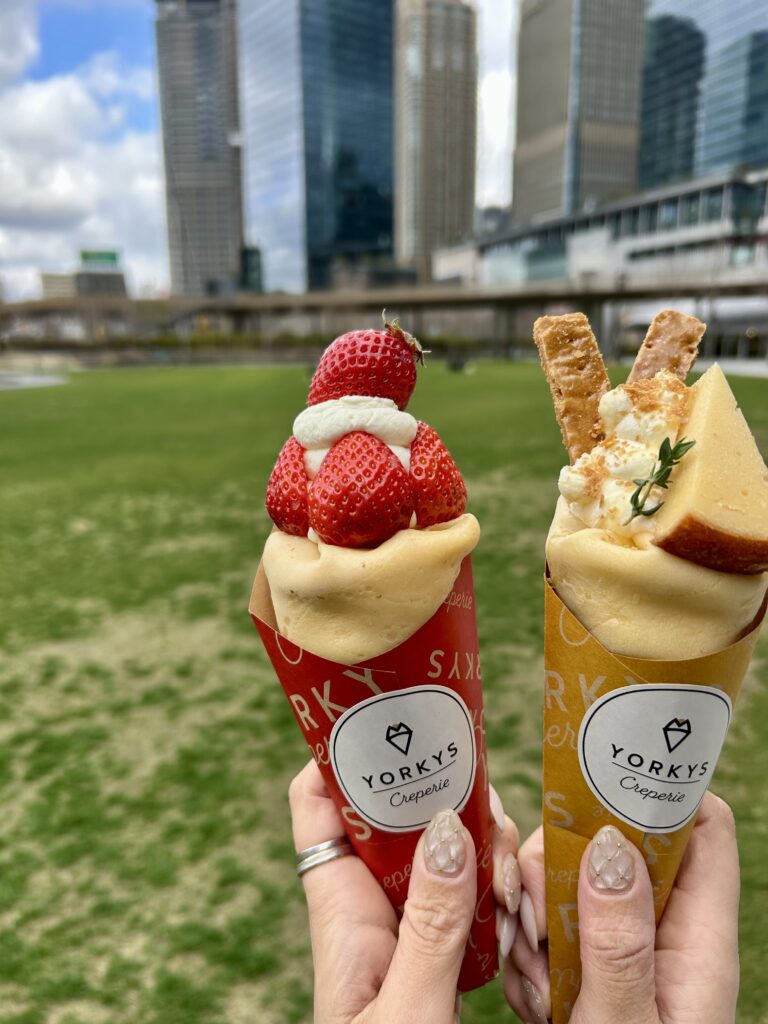 「YORKYS Creperie / PIECE OF BAKE うめきたグリーンプレイス店」さんは、クレープに生ドーナツ両方が楽しめる