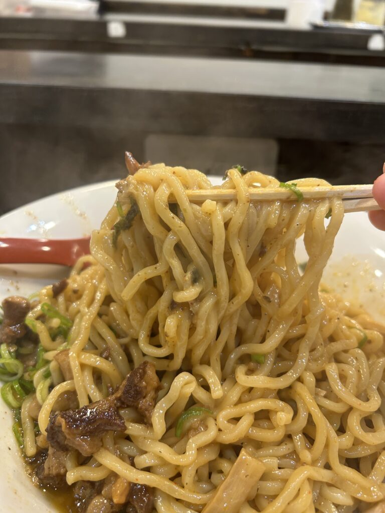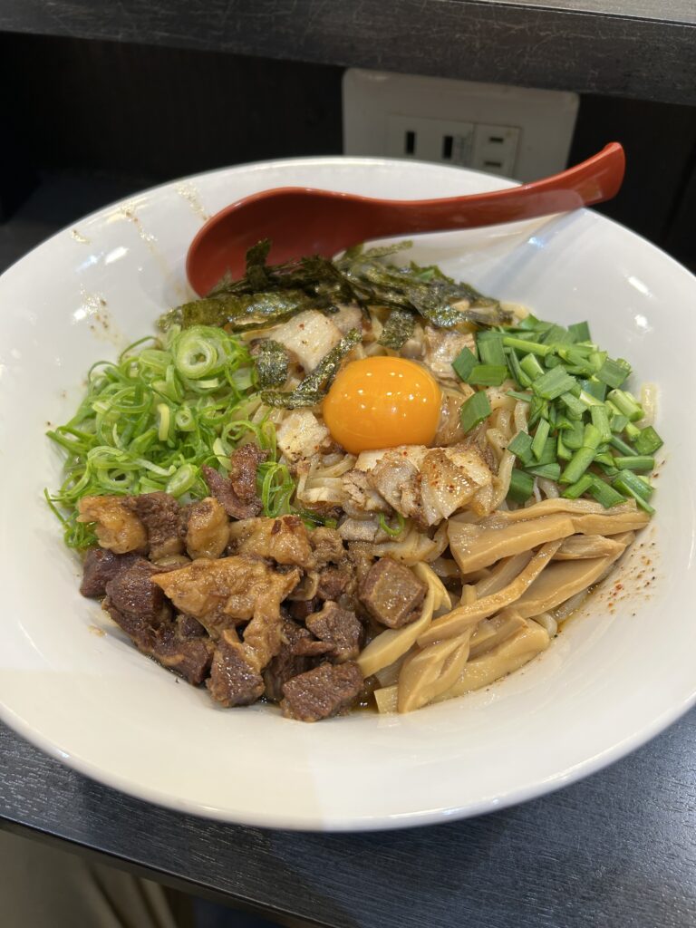 豚骨の旨味と魚介香る秘伝スパイスが加わった油そば。