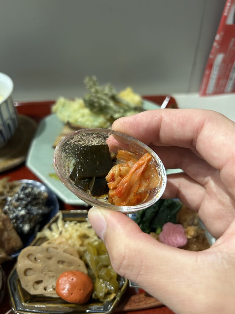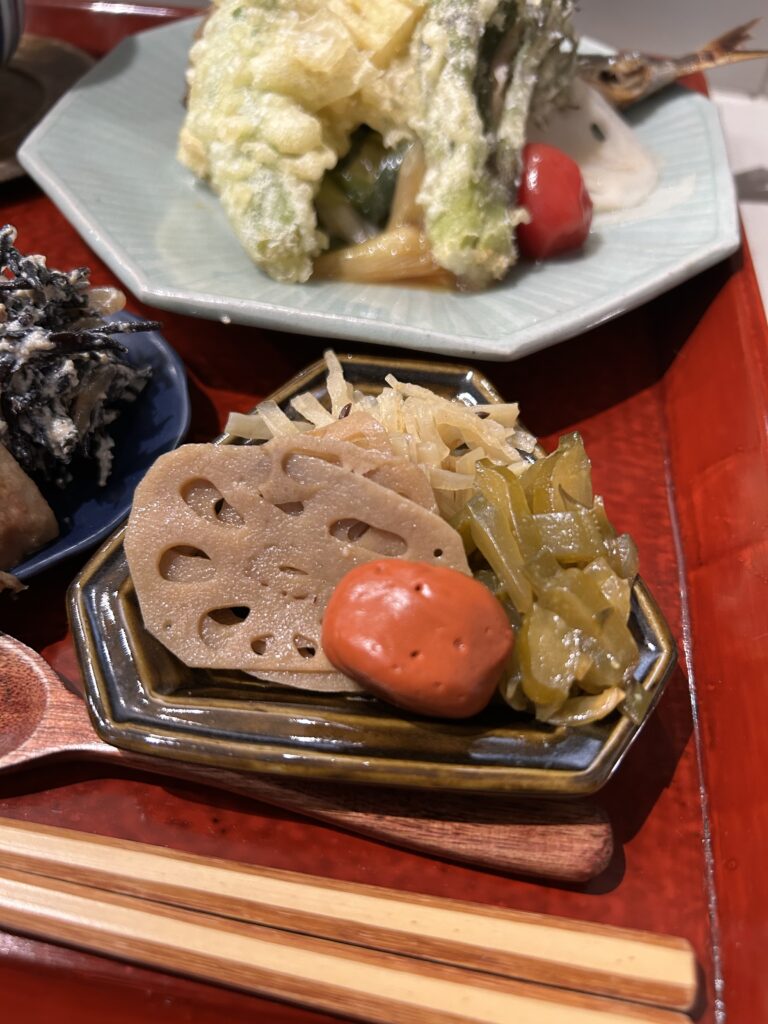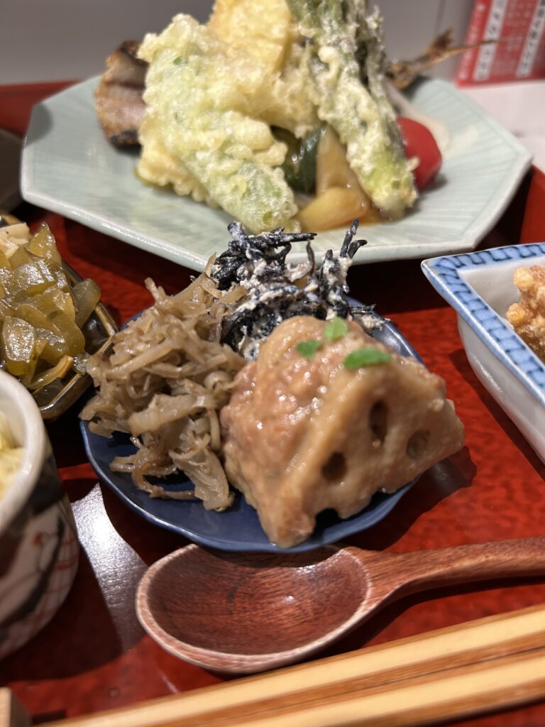 蓮根の肉挟み、ひじきの白和え、きんぴら蓮根など小鉢の種類の多さ!