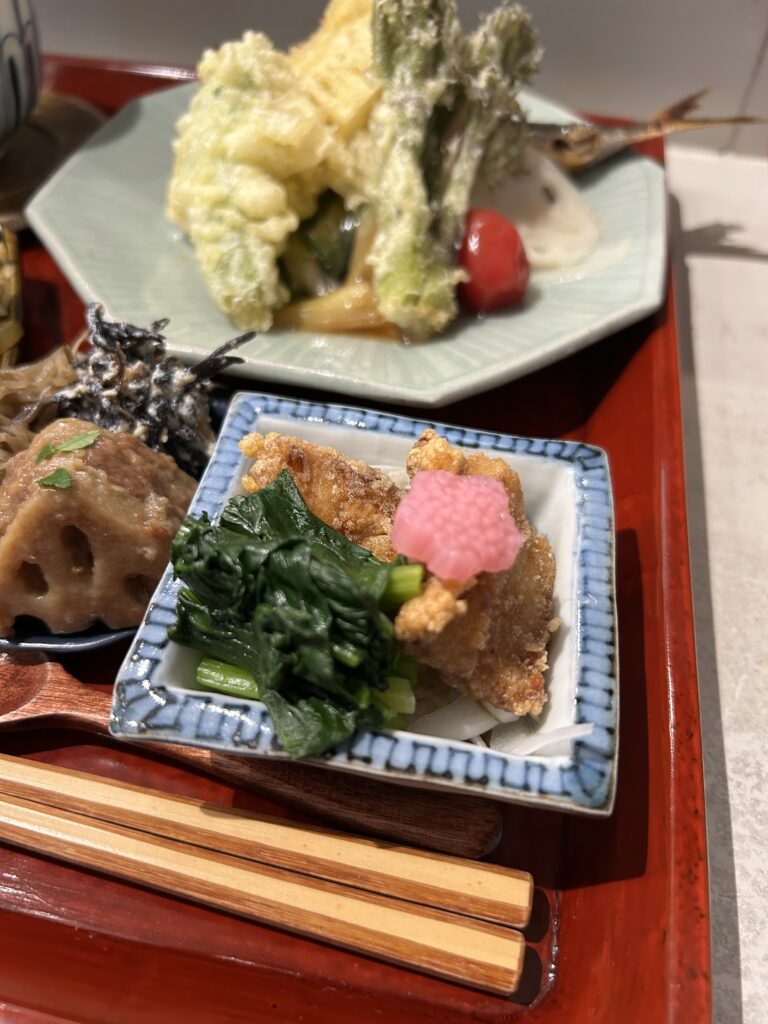 魚炭火焼き、土鍋で炊いたご飯、天ぷら数種類、小鉢が数種類、茶碗蒸しそしてお味噌汁とボリューム満点の定食。
