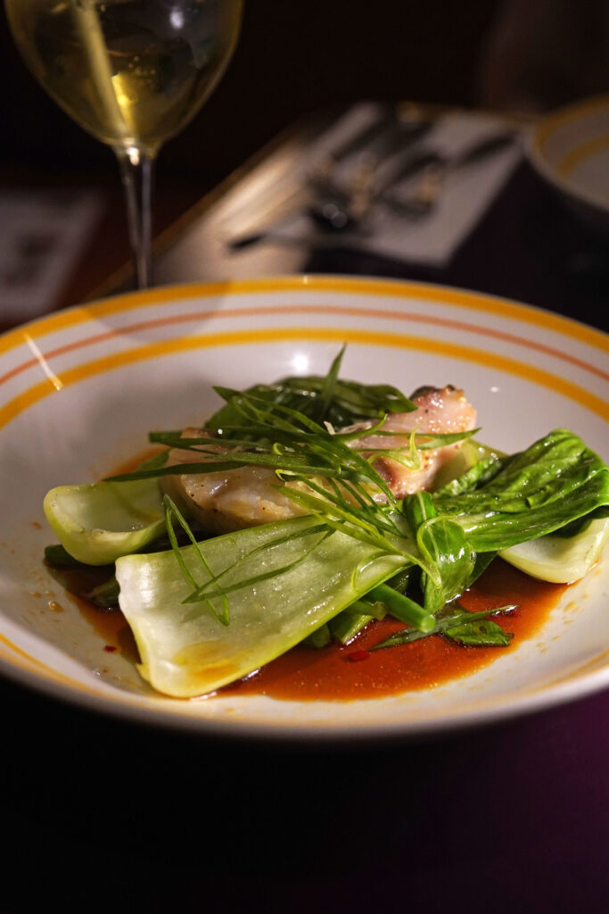 ローストした鱈に小松菜、スナップエンドウ、インゲン豆にスプリングオニオンとジンジャーをトッピング。