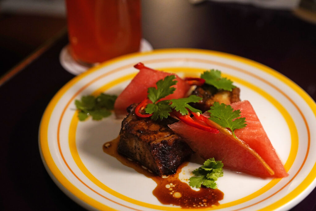 ジューシーなポークにスイカのもつ甘さがマッチしてコリアンダーとジンジャーがアクセント、さっぱりとした夏らしいメニューです。