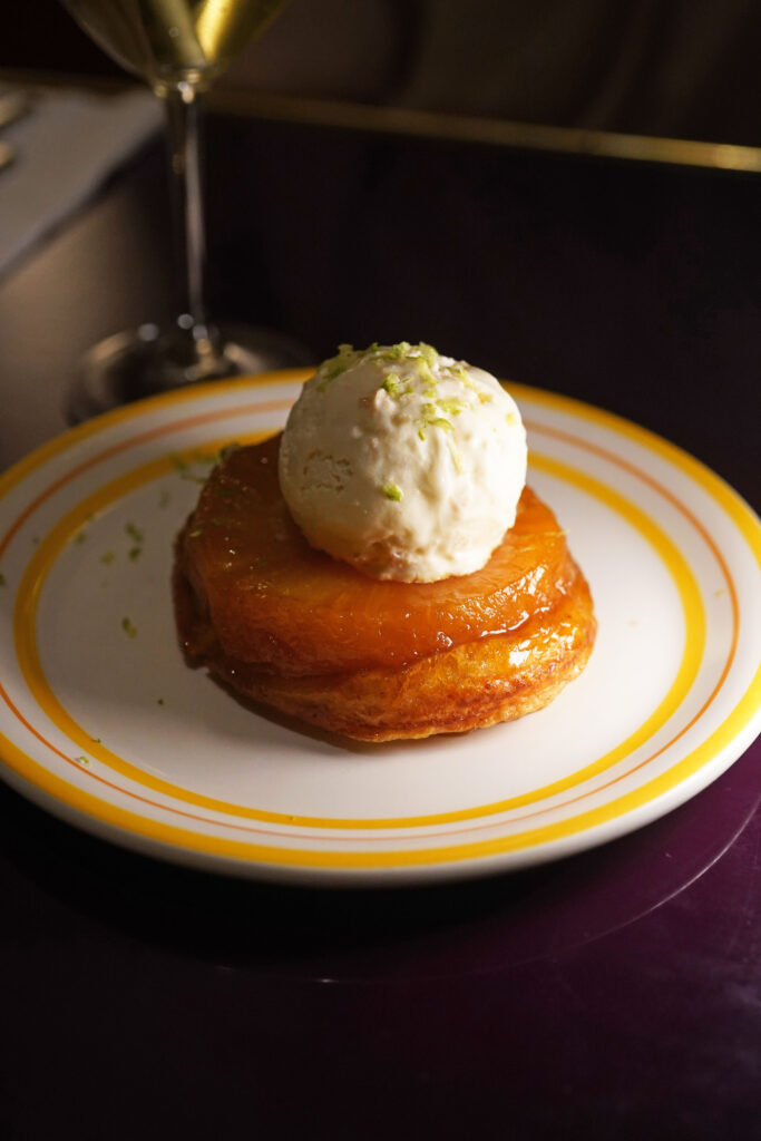 キャラメリゼしたパイナップルを敷き詰めて焼き上げた「タルトタタン」に自家製ココナッツセミフレッドをトッピング、仕上げにはライムゼストを散らしてあります。