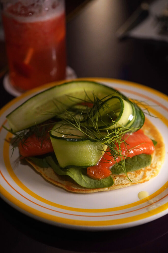 トッピングには厚めの自家製グラブラックスサーモン、きゅうりのリボンカット、ディルそしてほうれん草。