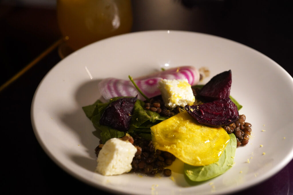 グリーンレンズ豆をベースにローストしたキャンディービーツとゴールデンビーツのピクルス、ベビースピナッチ、そしてオリーブオイル漬けされたリコッタチーズをトッピング。