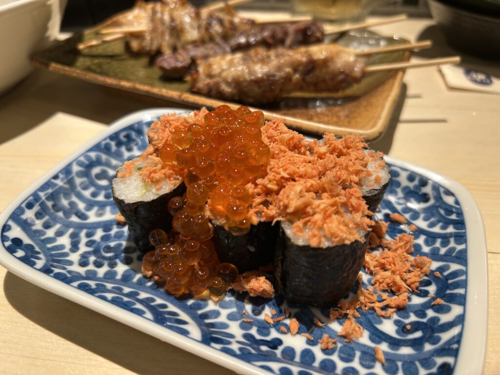 香ばしい海苔を使ったかっぱ巻き、その上にほろほろの鮭にいくらをトッピング。