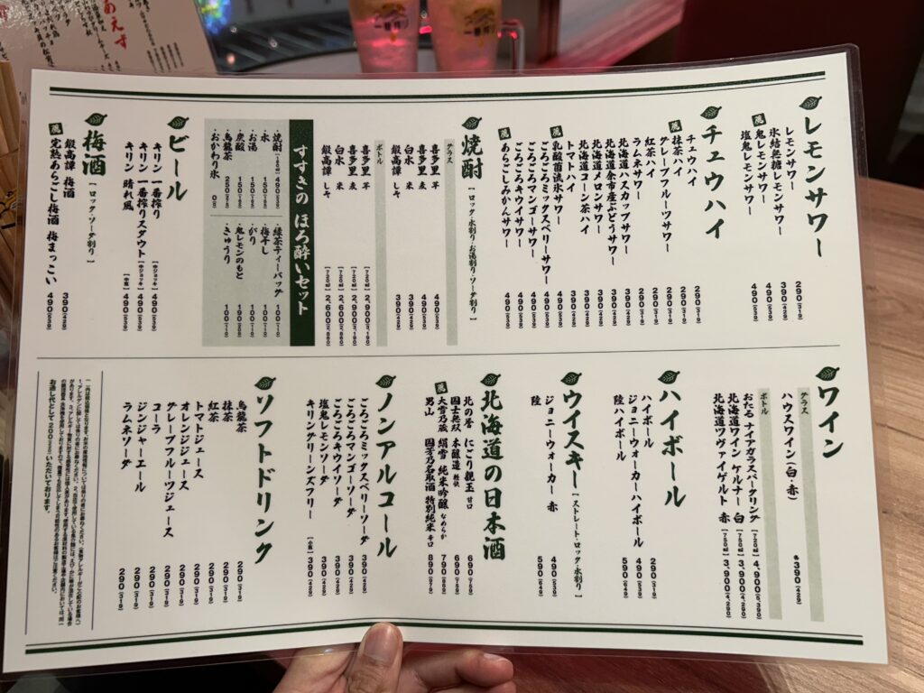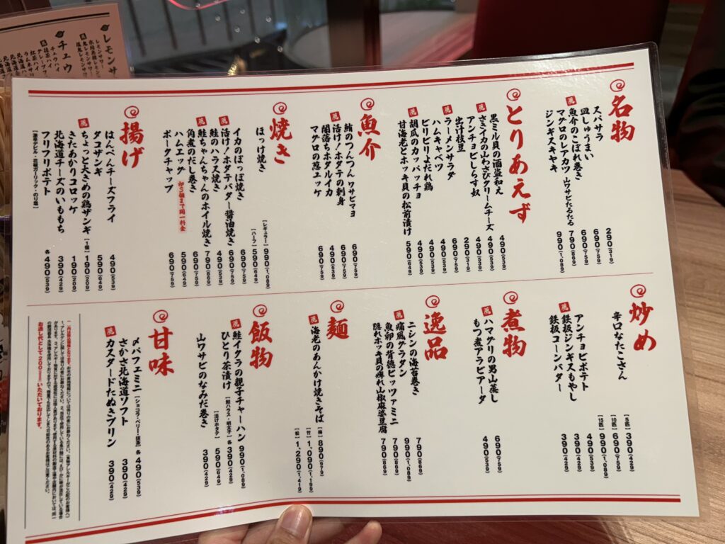 メニュー全般を見てみると札幌すすきののにぎわいを楽しめるがコンセプトという事で、海鮮を使ったものが各カテゴリーにあります。
