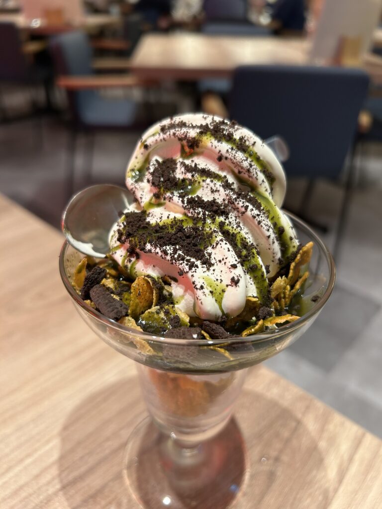 まろやかなアイスクリーム、フレークが抹茶ソースと相性抜群で甘さ控えめで食べやすかったです!