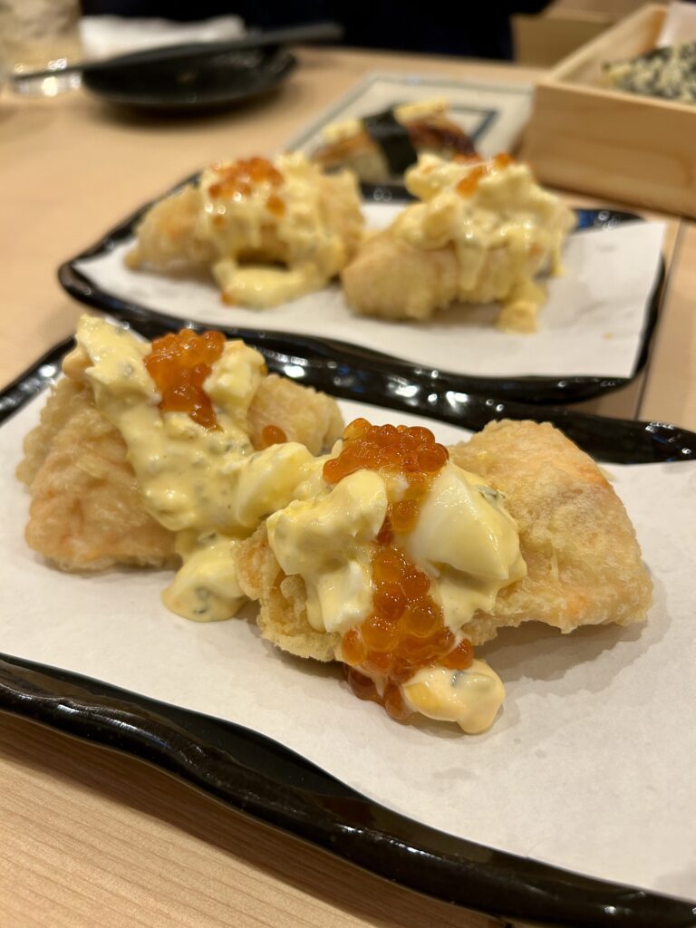 創作天ぷら、とり天大好きなので注文、タルタルにイクラがトッピングされていて嬉しかった。
