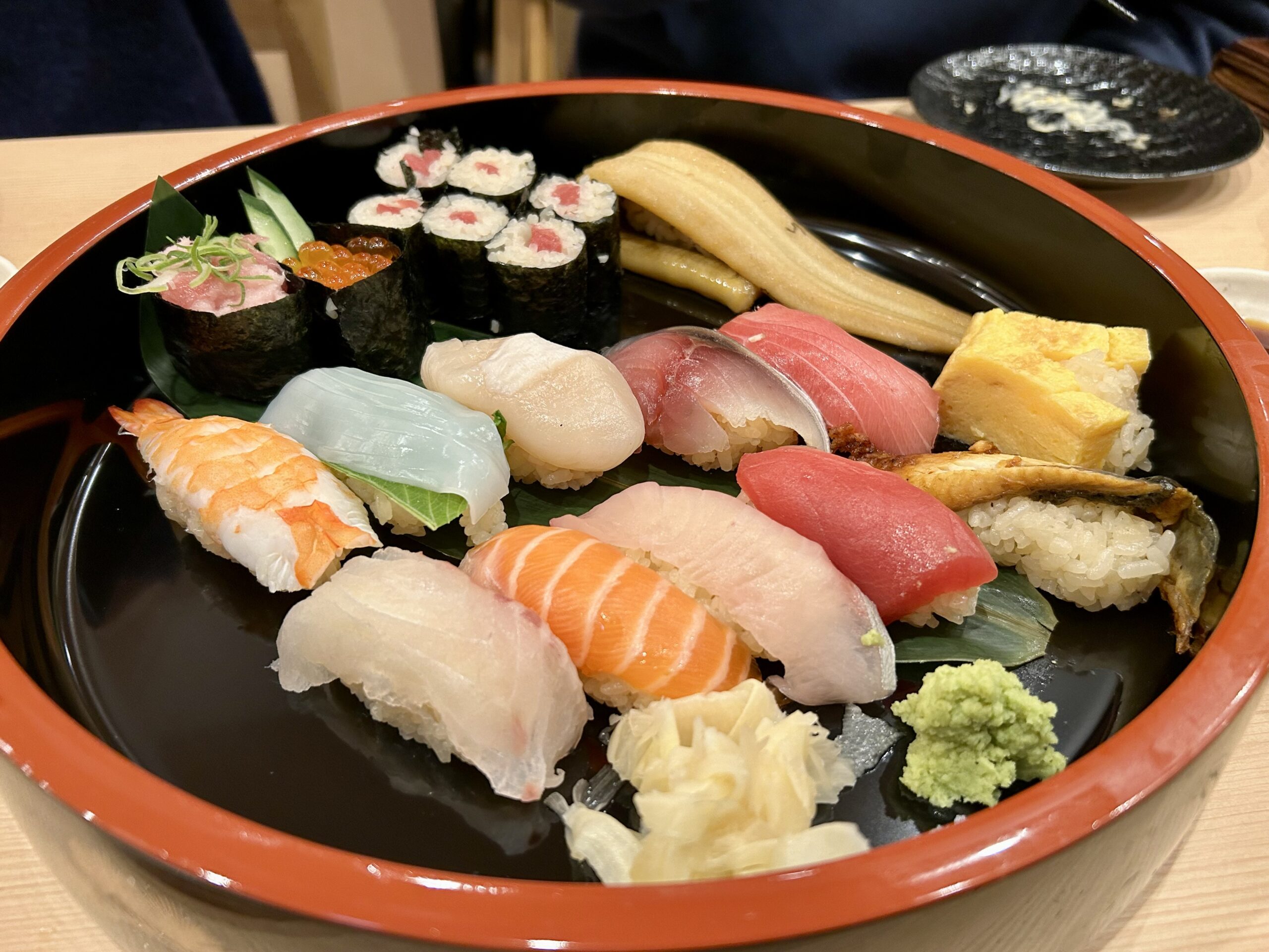 マグロ、サーモン、たこ、鯛、さより、ホタルイカにとろカンパチという内容。