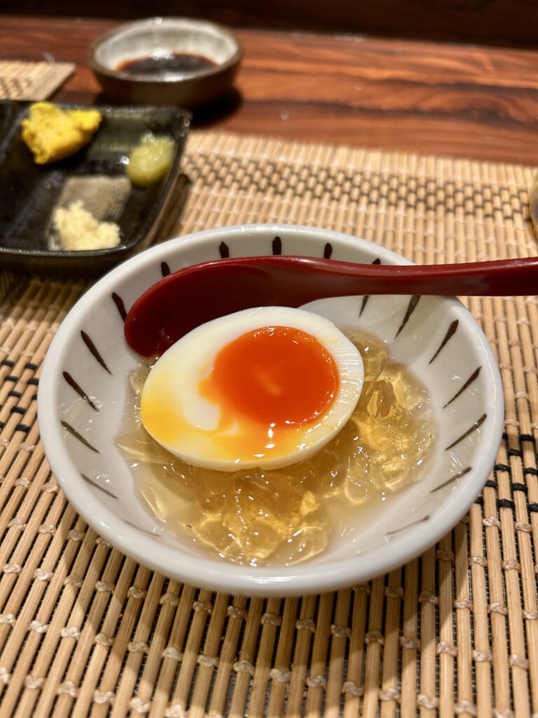 付き出しは、お出汁のジュレを使った半熟玉子。