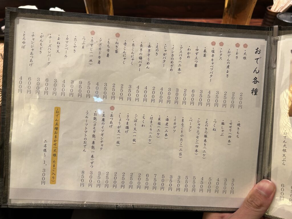 こだわりのお出汁を使ったおでんは大根や玉子、こんにゃくなどの定番からアボカド巾着やチーズハンバーグなどの変わり種のネタもあって豊富。