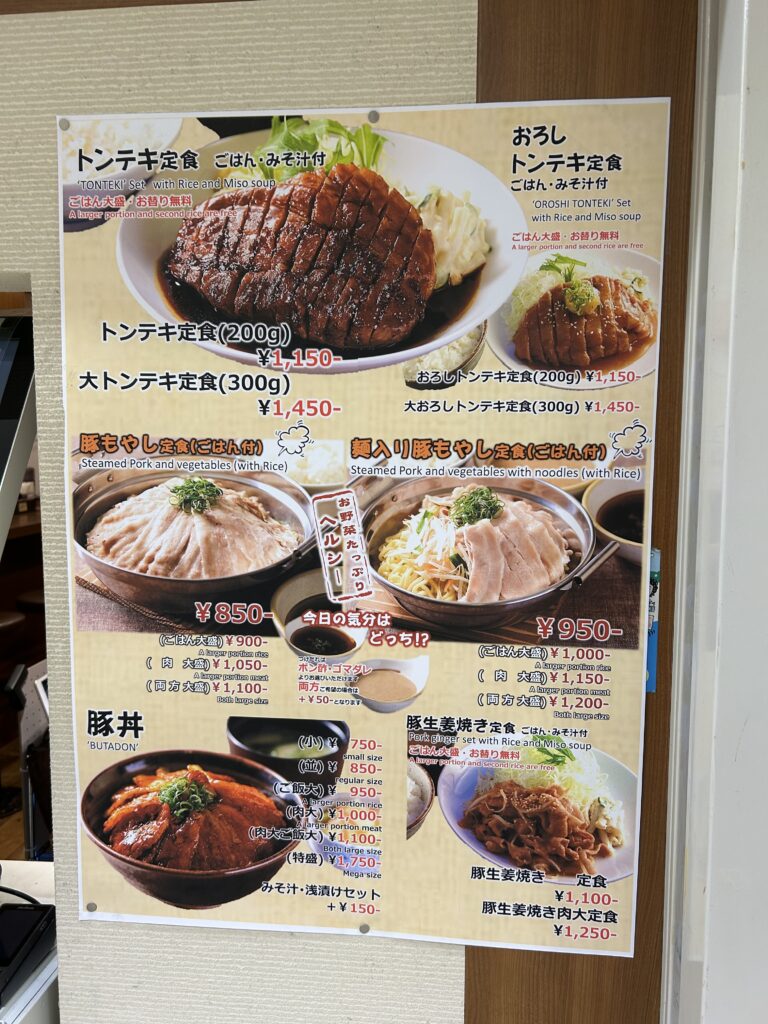 看板メニューのトンテキ定食、おろしトンテキ定食、生姜焼き定食はごはんの大盛り、おかわりが自由とサラリーマンには嬉しいサービス。