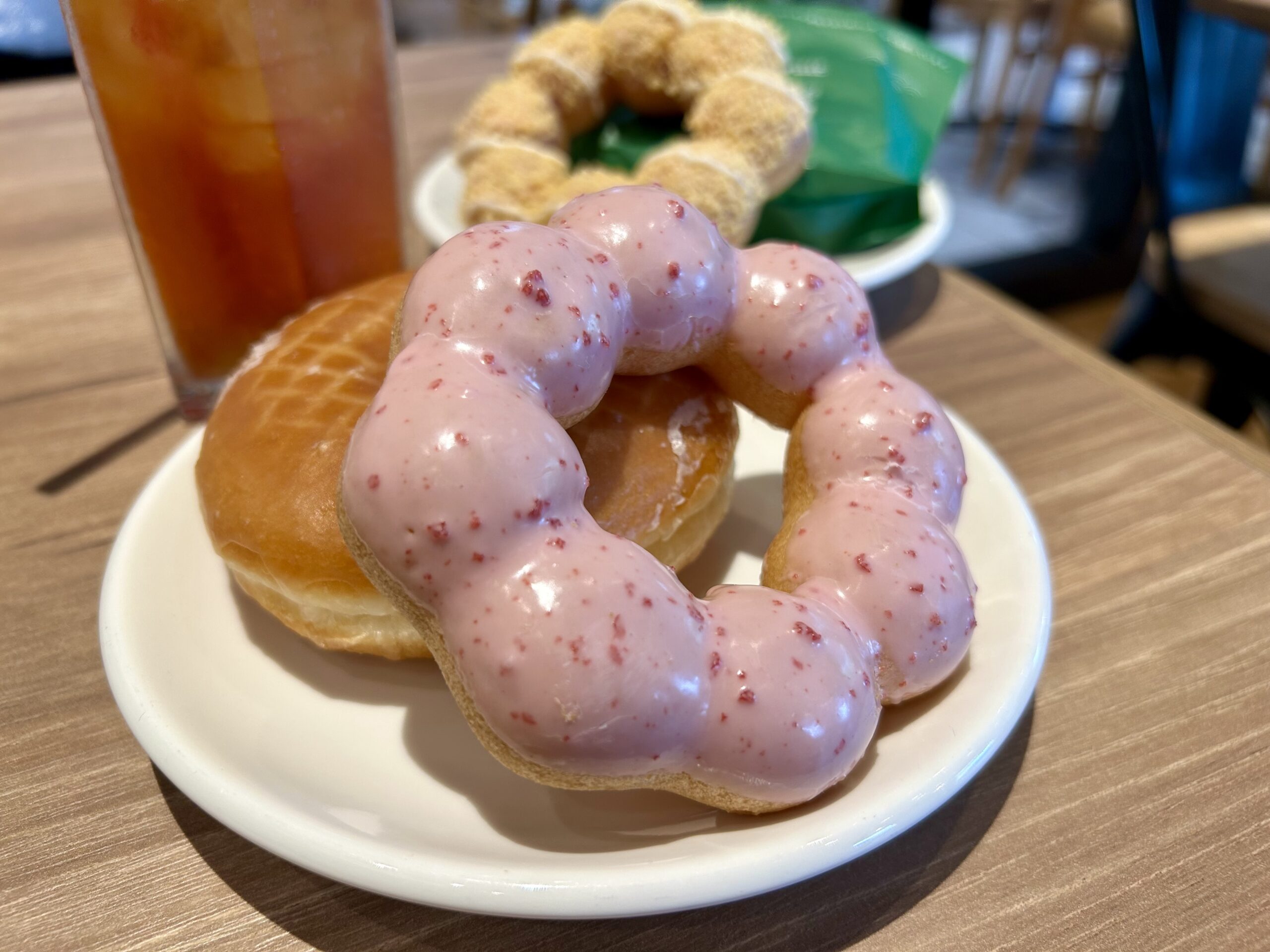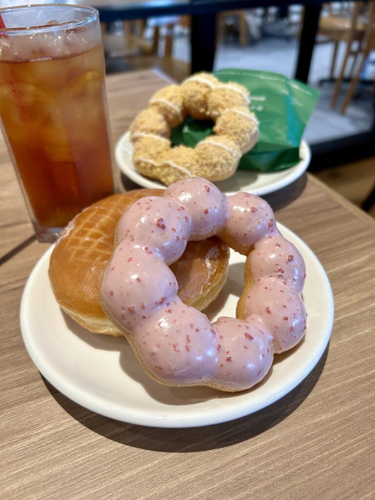 ドーナツはハニーディップやポン・デ・リングなど定番のものからいちごを使った珍しいものまでいろいろと揃っています。