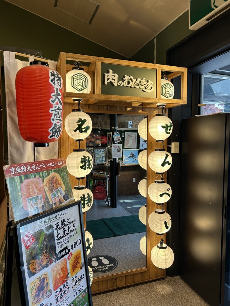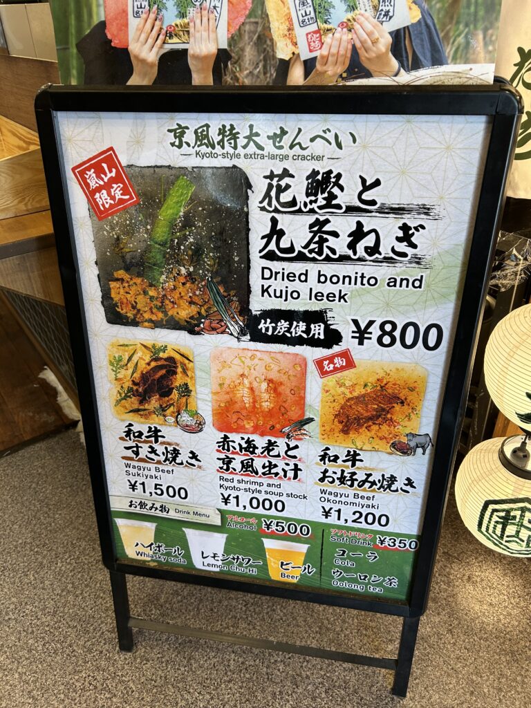 「肉のおだきち 嵐山店」さんは2024年5月にオープンした小エビ、九条ネギ、花鰹などを使った特大せんべいが名物のお店。