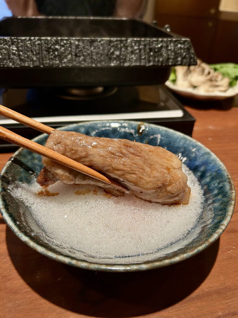ふわふわに泡立てられたメレンゲ卵にたっぷりとつけて食べると柔らかいリブロースの食感とお肉の風味が口の中いっぱいに広がり至福。